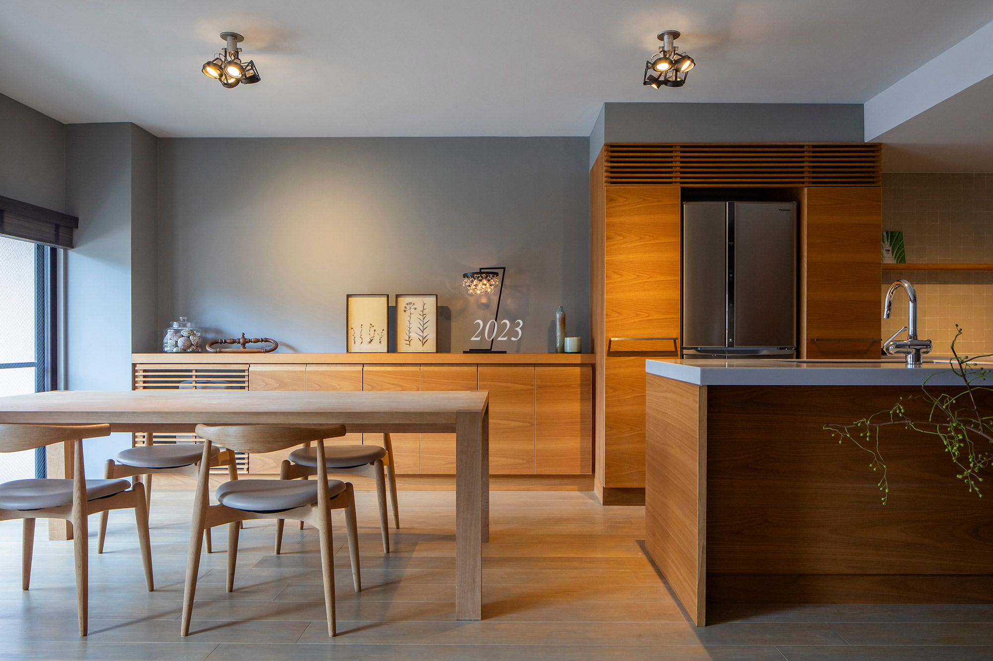 長い間リノベーション図面を頭に描いていた築20年のマンション。合板のフローリングやクロスと言った内装材の劣化はもちろんですが、キッチンカウンターを回り込むという導線の悪さを解決したかった事、LDK以外の空間が小作りで狭く美しくなかった事、玄関脇に土足で入れる収納を作りたかった事、それがリノベーションのきっかけでした。対面式のカウンターキッチンを取り壊しアイランドを包括したL型キッチンに、そのキッチンをLDと同空間にしたリノベーションを施しました。またそれぞれ別空間であったトイレとお風呂及び洗面脱衣も壁を取り払い1つの空間とし大きく広がりを持たせました。リノベーションは今ある空間を自分仕様にまたは家族仕様に変更して行くもの、そこに問題があり解決するという方向性は新築とは違ってまた面白みがあります。またこのような楽しみを加えることも。。LDKから見せたくないと寝室を仕切る収納棚の背面にテレビを設置、そこはベッドに座ってみられるホームシアターとなっており、ベッドヘッドの左右、マットレスの下に配したサウンドシステムが臨場感を与えてくれます。映画館に行けなくても十分、そう思わせてくれます。